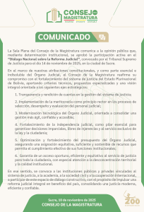 El Consejo de la Magistratura forma parte del Órgano Judicial y es responsable del régimen disciplinario de las jurisdicciones ordinaria, agroambiental y especializadas, del control y fiscalización, del manejo administrativo y financiero y de la formulación de políticas de gestión del Órgano Judicial.